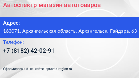 Автоспектр, магазин автотоваров по адресу 163071, Архангельская область, Архангельск, Гайдара, 63 в дальнейшем Организация, размещена в следующих категориях: