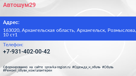 Автошум29 по адресу 163020, Архангельская область, Архангельск, Розмыслова, 10 ст1 в дальнейшем Организация, размещена в следующих категориях: