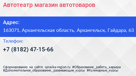 Автотеатр, магазин автотоваров по адресу 163071, Архангельская область, Архангельск, Гайдара, 63 в дальнейшем Организация, размещена в следующих категориях: