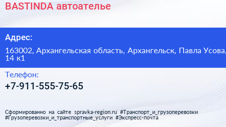 BASTINDA, автоателье по адресу 163002, Архангельская область, Архангельск, Павла Усова, 14 к1 в дальнейшем Организация, размещена в следующих категориях: