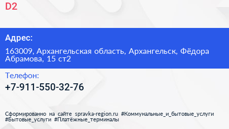 D2 по адресу 163009, Архангельская область, Архангельск, Фёдора Абрамова, 15 ст2 в дальнейшем Организация, размещена в следующих категориях: