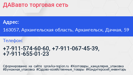 ДАВавто, торговая сеть по адресу 163057, Архангельская область, Архангельск, Дачная, 59 в дальнейшем Организация, размещена в следующих категориях: