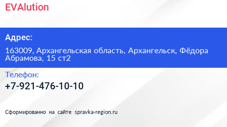 EVAlution по адресу 163009, Архангельская область, Архангельск, Фёдора Абрамова, 15 ст2 в дальнейшем Организация, размещена в следующих категориях: