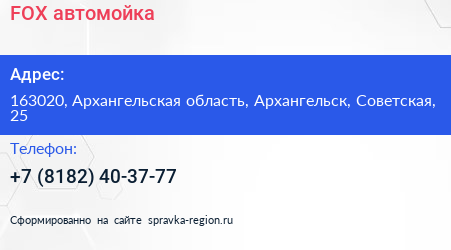 FOX, автомойка по адресу 163020, Архангельская область, Архангельск, Советская, 25 в дальнейшем Организация, размещена в следующих категориях: