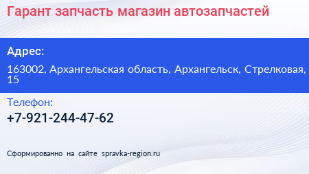 Гарант запчасть, магазин автозапчастей по адресу 163002, Архангельская область, Архангельск, Стрелковая, 15 в дальнейшем Организация, размещена в следующих категориях: