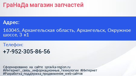 ГраНаДа, магазин запчастей по адресу 163045, Архангельская область, Архангельск, Окружное шоссе, 3 к1 в дальнейшем Организация, размещена в следующих категориях: