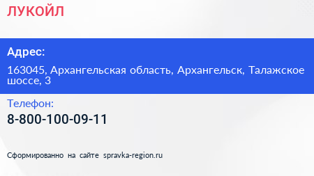 ЛУКОЙЛ по адресу 163045, Архангельская область, Архангельск, Талажское шоссе, 3 в дальнейшем Организация, размещена в следующих категориях:
