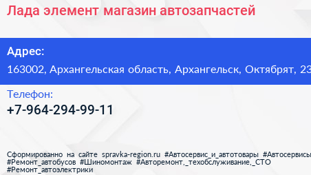 Лада элемент, магазин автозапчастей по адресу 163002, Архангельская область, Архангельск, Октябрят, 23 в дальнейшем Организация, размещена в следующих категориях: