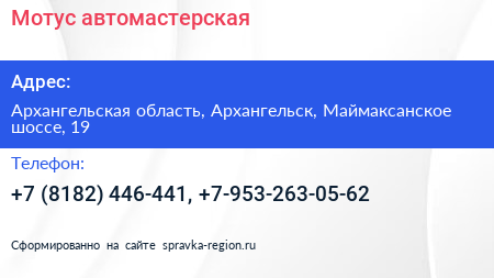 Мотус, автомастерская по адресу Архангельская область, Архангельск, Маймаксанское шоссе, 19 в дальнейшем Организация, размещена в следующих категориях: