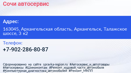 Сочи, автосервис по адресу 163045, Архангельская область, Архангельск, Талажское шоссе, 3 к2 в дальнейшем Организация, размещена в следующих категориях: