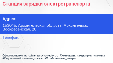 Станция зарядки электротранспорта по адресу 163046, Архангельская область, Архангельск, Воскресенская, 20 в дальнейшем Организация, размещена в следующих категориях: