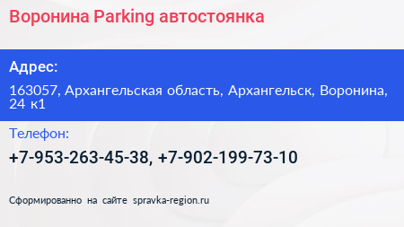 Воронина Parking, автостоянка по адресу 163057, Архангельская область, Архангельск, Воронина, 24 к1 в дальнейшем Организация, размещена в следующих категориях:
