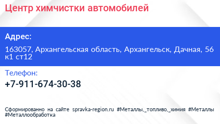 Центр химчистки автомобилей по адресу 163057, Архангельская область, Архангельск, Дачная, 56 к1 ст12 в дальнейшем Организация, размещена в следующих категориях: