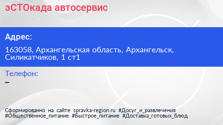 эСТОкада, автосервис по адресу 163058, Архангельская область, Архангельск, Силикатчиков, 1 ст1 в дальнейшем Организация, размещена в следующих категориях: