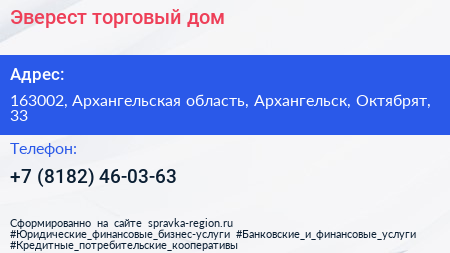Эверест, торговый дом по адресу 163002, Архангельская область, Архангельск, Октябрят, 33 в дальнейшем Организация, размещена в следующих категориях: