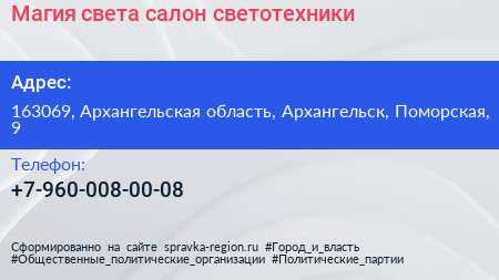 Магия света, салон светотехники по адресу 163069, Архангельская область, Архангельск, Поморская, 9 в дальнейшем Организация, размещена в следующих категориях: