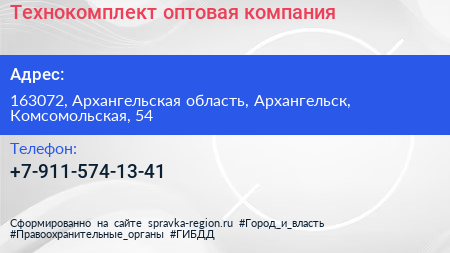 Технокомплект, оптовая компания по адресу 163072, Архангельская область, Архангельск, Комсомольская, 54 в дальнейшем Организация, размещена в следующих категориях: