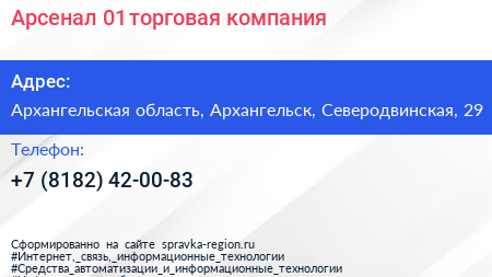Арсенал 01, торговая компания по адресу Архангельская область, Архангельск, Северодвинская, 29 в дальнейшем Организация, размещена в следующих категориях: