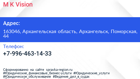 M. K. Vision по адресу 163046, Архангельская область, Архангельск, Поморская, 44 в дальнейшем Организация, размещена в следующих категориях: