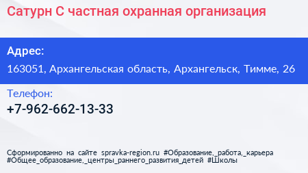 Сатурн-С, частная охранная организация по адресу 163051, Архангельская область, Архангельск, Тимме, 26 в дальнейшем Организация, размещена в следующих категориях: