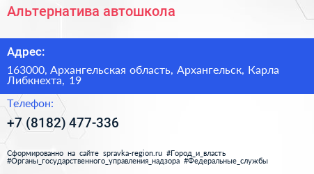 Альтернатива, автошкола по адресу 163000, Архангельская область, Архангельск, Карла Либкнехта, 19 в дальнейшем Организация, размещена в следующих категориях: