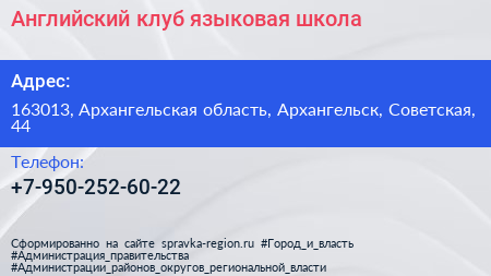 Английский клуб, языковая школа по адресу 163013, Архангельская область, Архангельск, Советская, 44 в дальнейшем Организация, размещена в следующих категориях:
