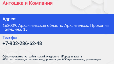Антошка и Компания по адресу 163009, Архангельская область, Архангельск, Прокопия Галушина, 15 в дальнейшем Организация, размещена в следующих категориях: