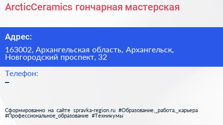 ArcticCeramics, гончарная мастерская по адресу 163002, Архангельская область, Архангельск, Новгородский проспект, 32 в дальнейшем Организация, размещена в следующих категориях: