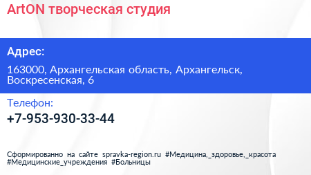 ArtON, творческая студия по адресу 163000, Архангельская область, Архангельск, Воскресенская, 6 в дальнейшем Организация, размещена в следующих категориях: