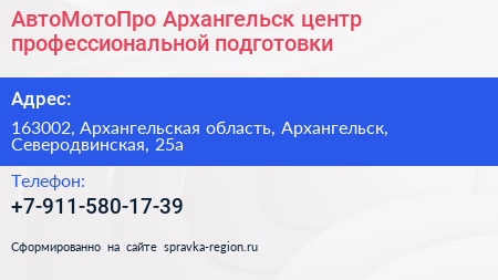 АвтоМотоПро Архангельск, центр профессиональной подготовки по адресу 163002, Архангельская область, Архангельск, Северодвинская, 25а в дальнейшем Организация, размещена в следующих категориях: