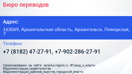 Бюро переводов по адресу 163069, Архангельская область, Архангельск, Поморская, 7 в дальнейшем Организация, размещена в следующих категориях: