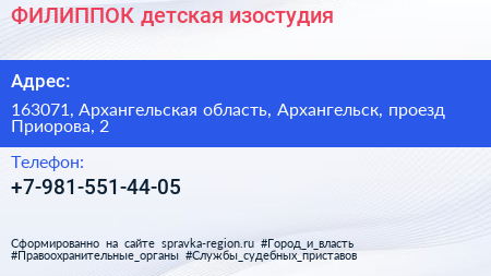 ФИЛИППОК, детская изостудия по адресу 163071, Архангельская область, Архангельск, проезд Приорова, 2 в дальнейшем Организация, размещена в следующих категориях: