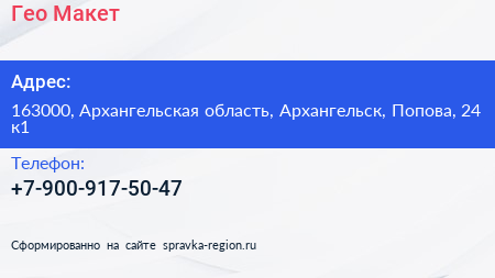 Гео Макет по адресу 163000, Архангельская область, Архангельск, Попова, 24 к1 в дальнейшем Организация, размещена в следующих категориях: