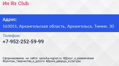 Ин Яз Club по адресу 163051, Архангельская область, Архангельск, Тимме, 30 в дальнейшем Организация, размещена в следующих категориях: