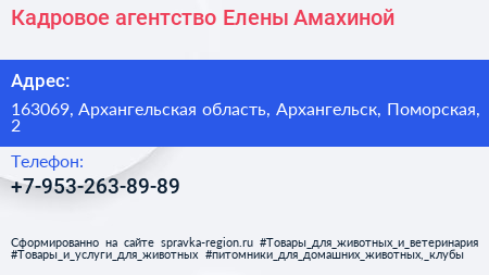 Кадровое агентство Елены Амахиной по адресу 163069, Архангельская область, Архангельск, Поморская, 2 в дальнейшем Организация, размещена в следующих категориях: