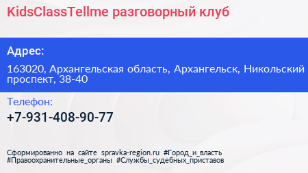 KidsClassTellme, разговорный клуб по адресу 163020, Архангельская область, Архангельск, Никольский проспект, 38-40 в дальнейшем Организация, размещена в следующих категориях: