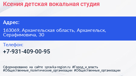 Ксения, детская вокальная студия по адресу 163069, Архангельская область, Архангельск, Серафимовича, 30 в дальнейшем Организация, размещена в следующих категориях: