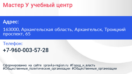 Мастер-У, учебный центр по адресу 163000, Архангельская область, Архангельск, Троицкий проспект, 65 в дальнейшем Организация, размещена в следующих категориях: