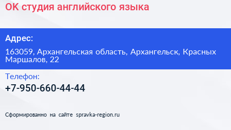OK, студия английского языка по адресу 163059, Архангельская область, Архангельск, Красных Маршалов, 22 в дальнейшем Организация, размещена в следующих категориях: