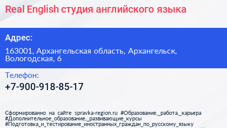 Real English, студия английского языка по адресу 163001, Архангельская область, Архангельск, Вологодская, 6 в дальнейшем Организация, размещена в следующих категориях: