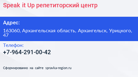 Speak it Up, репетиторский центр по адресу 163060, Архангельская область, Архангельск, Урицкого, 47 в дальнейшем Организация, размещена в следующих категориях: