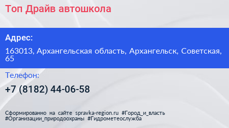 Топ Драйв, автошкола по адресу 163013, Архангельская область, Архангельск, Советская, 65 в дальнейшем Организация, размещена в следующих категориях: