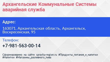Архангельские Коммунальные Системы, аварийная служба по адресу 163071, Архангельская область, Архангельск, Воскресенская, 95 в дальнейшем Организация, размещена в следующих категориях: