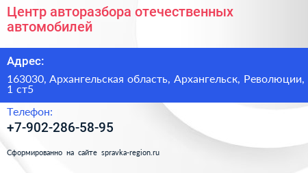 Центр авторазбора отечественных автомобилей по адресу 163030, Архангельская область, Архангельск, Революции, 1 ст5 в дальнейшем Организация, размещена в следующих категориях: