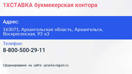 1XСТАВКА, букмекерская контора по адресу 163071, Архангельская область, Архангельск, Воскресенская, 93 к3 в дальнейшем Организация, размещена в следующих категориях:
