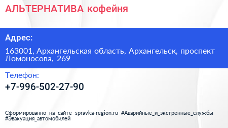 АЛЬТЕРНАТИВА, кофейня по адресу 163001, Архангельская область, Архангельск, проспект Ломоносова, 269 в дальнейшем Организация, размещена в следующих категориях: