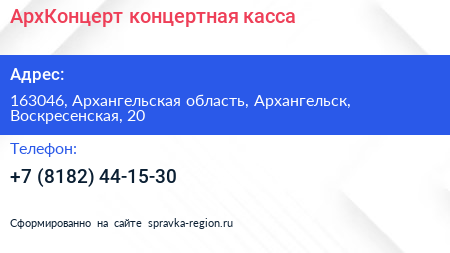 АрхКонцерт, концертная касса по адресу 163046, Архангельская область, Архангельск, Воскресенская, 20 в дальнейшем Организация, размещена в следующих категориях: