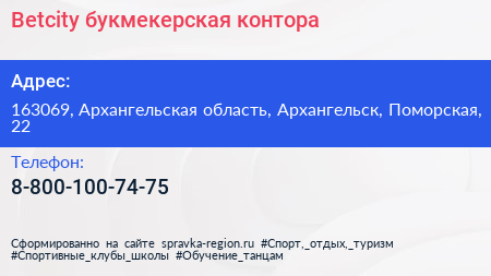 Betcity, букмекерская контора по адресу 163069, Архангельская область, Архангельск, Поморская, 22 в дальнейшем Организация, размещена в следующих категориях: