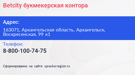 Betcity, букмекерская контора по адресу 163071, Архангельская область, Архангельск, Воскресенская, 99 к1 в дальнейшем Организация, размещена в следующих категориях: