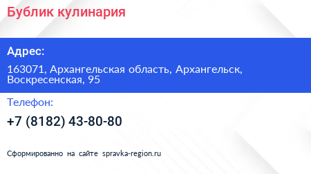 Бублик, кулинария по адресу 163071, Архангельская область, Архангельск, Воскресенская, 95 в дальнейшем Организация, размещена в следующих категориях: